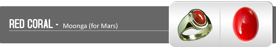 | It is said that Red Coral instills courage in its wearer. It also helps in curing blood -related diseases. It is normally red in color. Coral ensures material happiness, recovery from diseases indicated by Mars such as fever, cough, bilious complaints, smallpox, chickenpox, headache, loss of vitality, piles, boils, measles etc. It should be worn in gold or copper, and should be of 9, 11, 12 grams, on Tuesday on ring finger of right hand. It is a hot stone. |